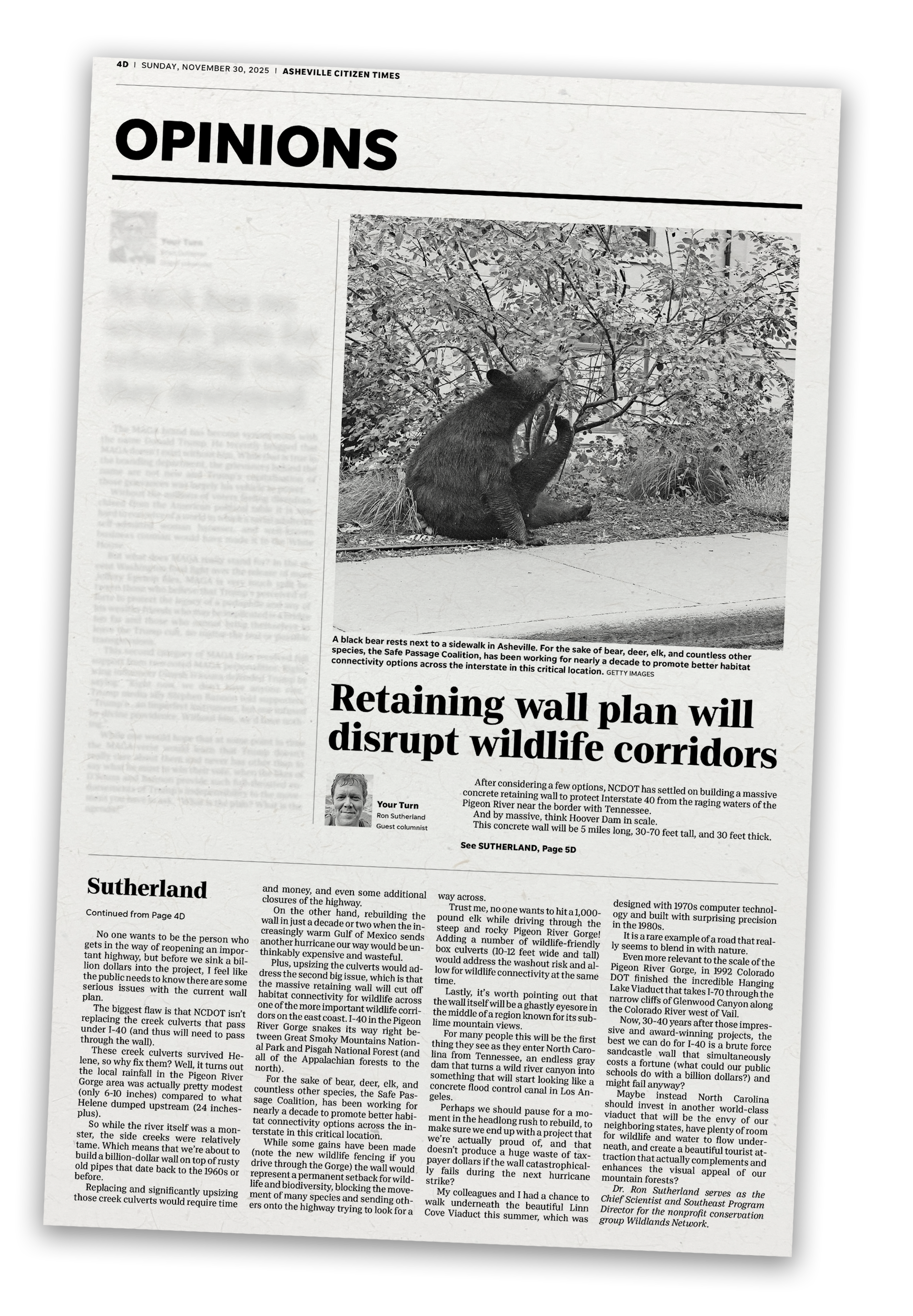 This opinion piece by Dr. Ron Sutherland originally ran in the Nov. 30, 2025 Asheville Citizen Times. Sutherland serves as the Chief Scientist and Southeast Program Director for the nonprofit conservation group Wildlands Network, a partner of Safe Passage.